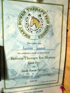 Jo was so impressed at what Bowen Therapy had done for her when all other western medicine therapy’s and medical specialists had failed she was very keen to apply the same practice to lame and troubled horses and dogs.